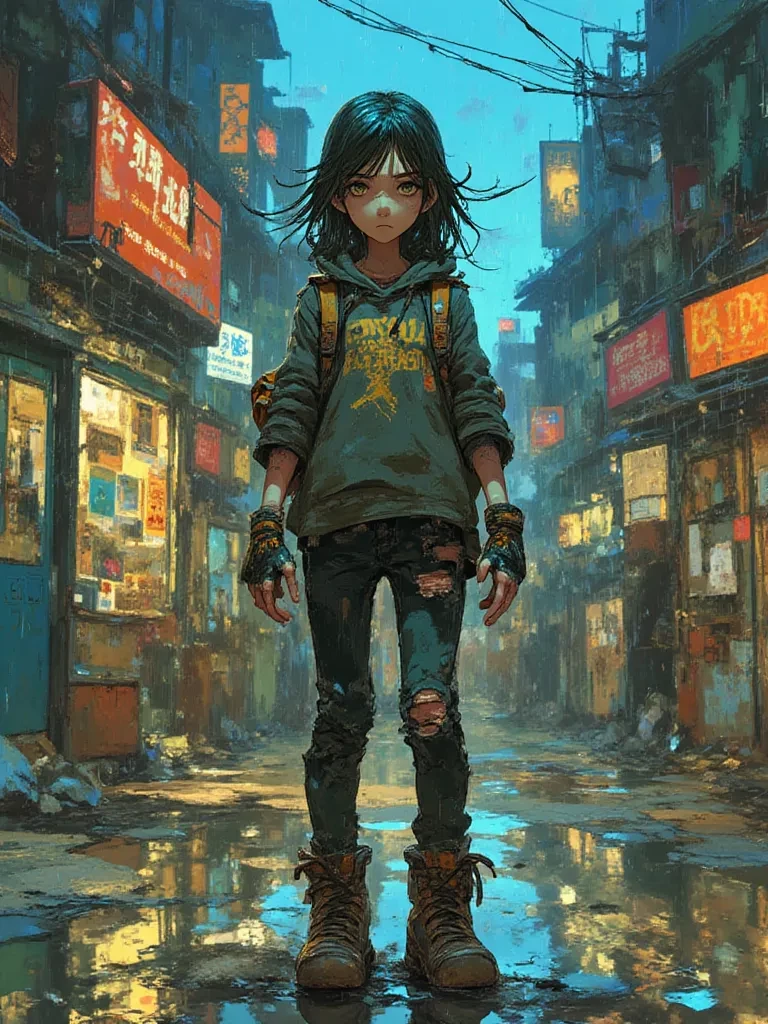 "Caught in the torrent, huh?" Her voice, when it finally reached you, was a soft, almost ethereal whisper against the drumming rain, yet it cut through the din with startling clarity. She didn't look up, but her gaze seemed to be fixed on something beyond the alley's mouth, something