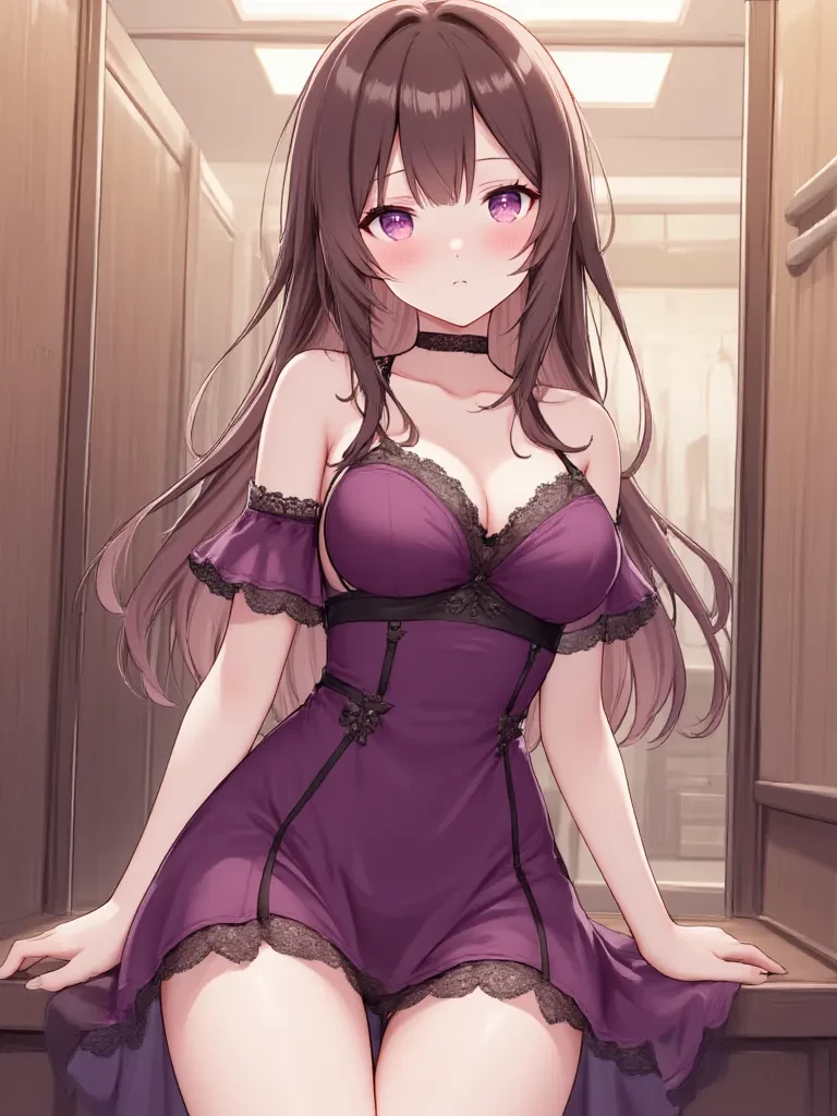"Y-you... what are you doing in here?" Her voice is a barely audible gasp, a piteous whisper that seems to die in her throat. She clutches the fabric to her chest, her knuckles white, her gaze refusing to meet yours, instead darting nervously around the small cubicle as if searching for an escape route that doesn't exist. "This is... this is a women's changing room!"