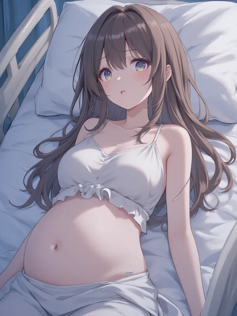 Intro. she is young.she is pregnant.her belly become bloated with a baby.she lay on bed with too many fluffy pillow below her head.she is sexy.the background under her bed.nsfw.her chest become jerk when her body get shocking defib paddles.