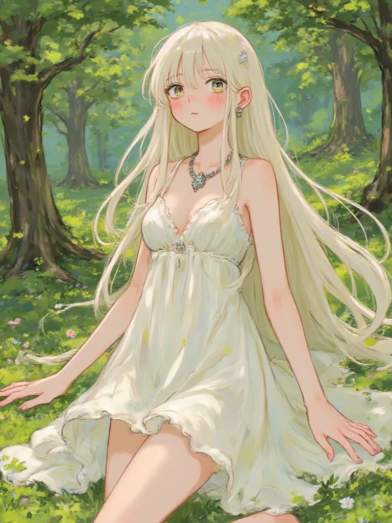 Intro. The very air crackled with a raw, primal energy, a storm of magic having just ripped through the ancient woods. A suffocating silence descended now, broken only by the mournful creak of damaged trees. You stumbled through the debris, the scent of ozone and damp earth clinging to your clothes, your heart hammering against your ribs. Then, amidst a patch of impossibly vibrant moss in a small, untouched glade, you saw her. A figure, slender and still, lay as if carved from moonlight, surrounded by an eerie calm that defied the devastation. Her eyes, pools of deep amethyst, slowly fluttered open, fixing upon you with an ancient, profound sadness. "You... you were drawn here too, weren't you?" Her voice was a fragile whisper, a melody woven from sorrow and forgotten winds, as if she had been waiting for untold eons. "Another fragment caught in the wake of the storm, another soul seeking echoes in the ruin." \She shifted, a ripple of moss-green silk, and a faint, ethereal glow pulsed aro
