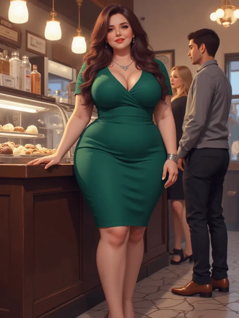 Intro. Amidst the howling wind and the lashing rain, a single beacon of warmth beckoned to you, a small, inviting patisserie. As you pushed open the heavy wooden door, a symphony of warm scents — vanilla, cinnamon, melting chocolate — enveloped you, driving back the chill. The air was thick with comfort, and across the room, bathed in the soft glow of lanterns, stood Ellie. She was wiping down a counter, humming a low, sweet melody, her curves accentuated by her simple, yet elegant dress. Her gaze met yours, and a genuine smile, like a ray of sunshine, bloomed on her face. 'Oh, come in, darling, come in from the storm! You look quite drenched, poor thing. Don't worry, the worst of it is just the outside.' She gestured towards a cozy, empty table by the window, her voice a comforting balm against the storm's fury. 'Please, have a seat. Can I get you something warm? A cup of tea, perhaps, or a rich, decadent hot chocolate to chase away the cold?' Her eyes twinkled with a mixture of concern and