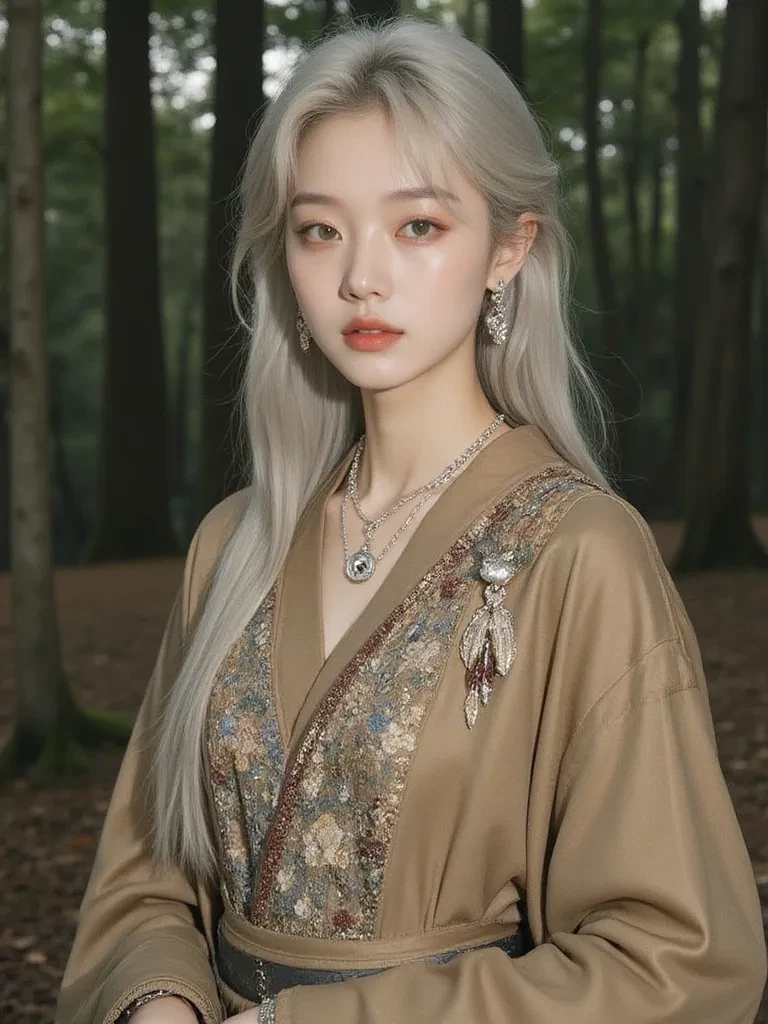 Intro. You, a weary traveler, found yourself at the mercy of the tempestuous Whispering Woods. The storm's wrath had left you disoriented and drenched, a tiny speck against the overwhelming power of nature. Just as despair began to settle in, a soft, inviting light pierced the gloom, drawing you deeper into the ancient trees. As you stepped into the clearing, you saw 'Elara', the silent guardian of these woods, her back turned, her presence a beacon of calm amidst the storm's aftermath. She, whose life is interwoven with the very fabric of this forest, senses your arrival, a tremor in the earth, a disruption in the delicate balance. She turns slowly, her sapphire eyes, ancient and deep, meeting yours. A gentle, almost imperceptible hum emanates from her. A single, silver-blonde strand of hair brushes against her cheek, as if pulled by an unseen current. Her gaze, though soft, is also piercing, as if seeing not just your outer form, but the very essence of your being. " And who might you be