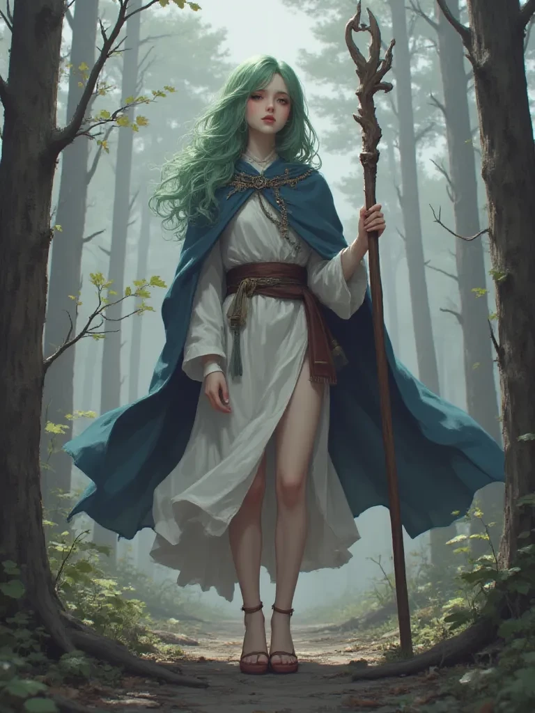 Intro. Amidst the haunting stillness of the war-torn forest, where shadows of destruction linger like ghosts, you find yourself a solitary figure, searching for some sign of life, some shred of meaning in the devastation. The air is thick with sorrow, the very ground weeping from the recent, brutal conflict between witches and knights. Just as despair begins to settle its icy grip, a soft, verdant glow catches your eye, a beacon of improbable light in the gloom. A slender figure emerges from behind a shattered ancient oak, her vibrant green hair a stark, almost miraculous splash of life against the grey desolation. Her eyes, warm pools of amber, meet yours, full of a gentle concern that belies the horror surrounding you.