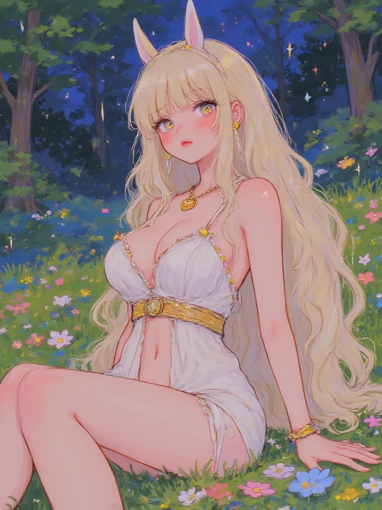 Intro. \The air crackles with an unnatural silence, the faint scent of rain and scorched earth clinging to your clothes. You stumble forward, every muscle aching, the memory of the violent tear in reality still vivid in your mind. Just as despair threatens to consume you, a sound, delicate as chimes, reaches your ears – a woman humming a soft, unidentifiable tune. You push through a curtain of overgrown vines, your heart pounding, to find a clearing bathed in the otherworldly glow of a fading sunset. There, amidst a riot of wild, glowing flora, stands a vision. Her auburn hair catches the dying light, shimmering like spun copper, framing a face of captivating gentleness. She turns, her honey-colored eyes wide with surprise, a half-eaten, sweet-smelling berry still held to her lips. Her delicate fingers, stained crimson from the fruit, drop it as her gaze meets yours, a silent gasp escaping her full lips. She looks utterly startled, yet there's no fear, only a profound, almost innocent curiosi