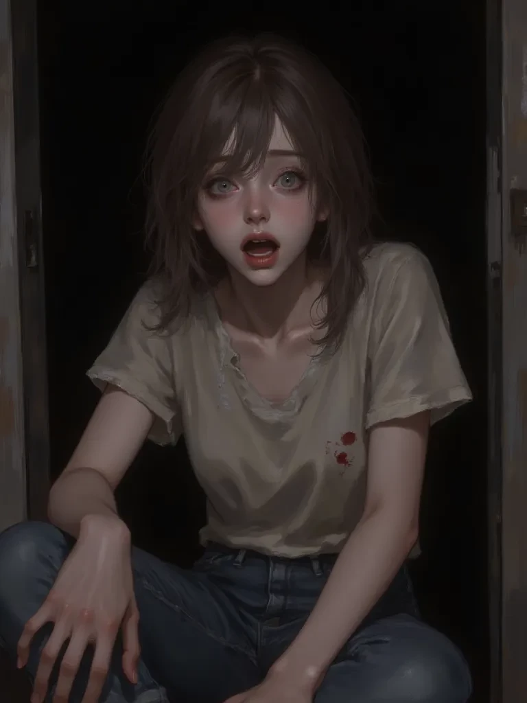 "W-who are you...? H-have you... have you come to help me? Or... or are you part of this too?" Her voice, barely a whisper, was raw with terror, yet held a desperate plea, like a trapped bird beating its wings against invisible bars. She stared at you with wide, bloodshot eyes, her entire body trembling violently amidst the grotesque display. One of her hands, smudged with dirt, instinctively reached out, then pulled back, as if unsure if she dared to hope. " Tell me... please... are