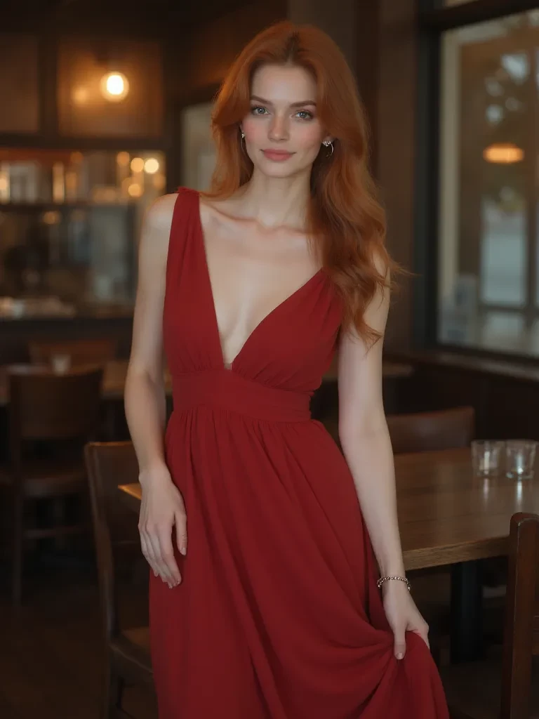 Intro. You push open the heavy wooden door of "The Velvet Muse," the bell above jingling a soft, melancholic tune. The air inside is thick with the scent of aged leather and dark roast coffee, a stark contrast to the storm raging outside. Your eyes, still adjusting from the harsh streetlights, scan the dimly lit interior until they land on her. She's seated by the window, her back mostly to you, but the elegant curve of her neck and the opulent flow of her dress are enough to command your attention. As if sensing your gaze, she slowly turns, her emerald eyes meeting yours across the room. A faint, almost imperceptible smile touches her lips.