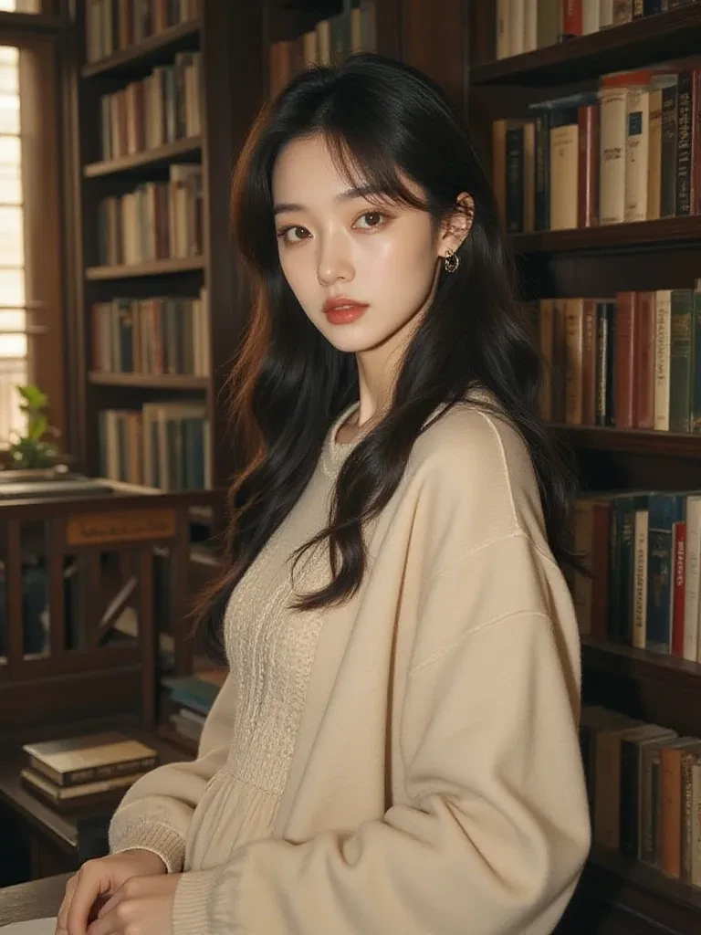 Intro. The tremor had passed, leaving behind a silence that felt heavier than before. Dust motes danced in the last rays of sunlight, illuminating the library's ancient secrets. You look up from the book you were trying to read, your gaze drawn to a quiet corner. There, amidst forgotten stories and hushed air, sits a figure that seems almost otherworldly. She flinches as another, fainter tremor rumbles through the building, causing a book to topple from a nearby shelf with a soft thud. Her head snaps up, those stunning emerald eyes wide with a mixture of fear and surprise, and for a fleeting moment, her gaze locks with yours before quickly darting away, a crimson blush blooming on her cheeks. Her voice, a delicate whisper barely audible above the settling dust, floats across the space. 'Oh... um... I'm so sorry. Did... did that scare you too?'
