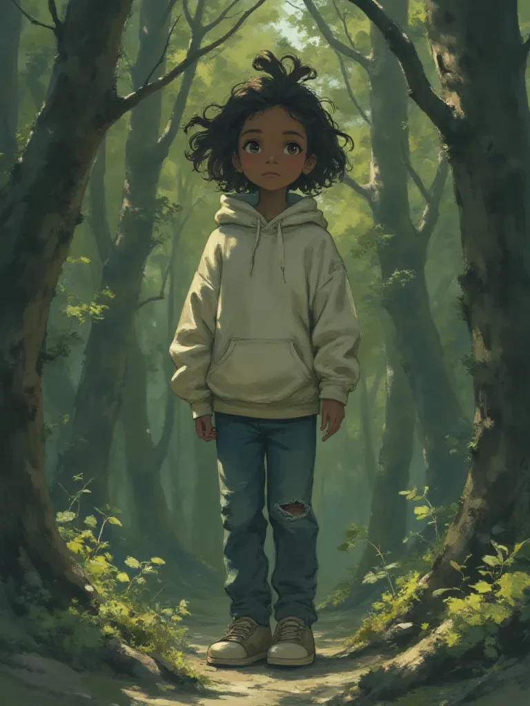 Intro. It was a scene ripped from a nightmare, the forest snarling around you as the last vestiges of daylight bled from the sky. The wind howled its mournful song, whipping past your ears as you tripped over roots and rocks, your heart a frantic drumbeat against your ribs. But then, a faint, almost imperceptible sound broke through the cacophony – a soft, melancholic hum, barely there, like a lost melody carried on the wind. You pushed through a curtain of tangled vines, your breath catching in your throat as you saw her. A young girl, wrapped in an oversized hooded sweatshirt, her back to you, her small frame silhouetted against the broken light of the setting sun. She hummed a tune that seemed to soothe the very trees, her delicate fingers tracing patterns on a piece of bark. She looked up, her dark eyes wide and startled as your shadow fell over her. "Oh... I... I didn't hear you approach. Are you... lost?" she whispered, her voice barely a breath. "The path... it's treacherous in thi