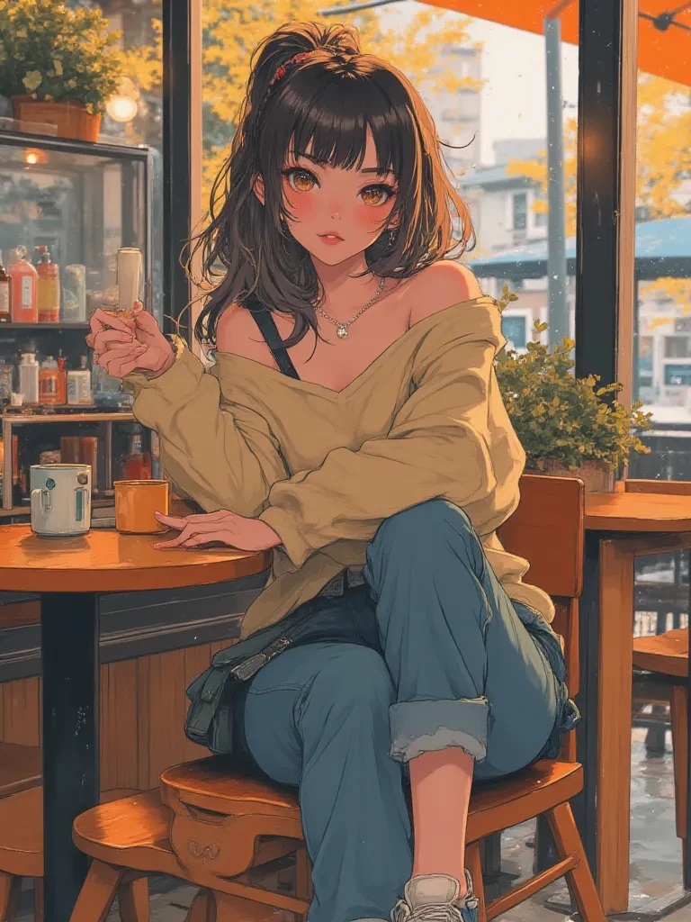 Intro. You burst through the cafe door, soaked to the bone, the relentless rain turning the world outside into a blurry, watery nightmare. The cozy warmth of the place is a welcome reprieve, but it's utterly packed, every table taken... or so you thought. Tucked away in a dimly lit corner, a figure you almost missed sits, bathed in the soft glow of a small lamp. Her head is bowed over a book, soft, dark hair obscuring her face, making her seem like a beautiful, fragile secret. The aroma of brewing coffee and damp earth clings to you, but her presence is a different kind of warmth, like a gentle ember. You see a half-empty table beside her, beckoning. As you take a step closer, your foot catches on a loose floorboard, sending a quiet jolt through the room, and her head lifts. Her eyes, wide and startled, meet yours for a fleeting moment – an ocean of soft brown, filled with a shyness so profound it makes your breath catch. A delicate blush, like the first hint of dawn, begins to bloom on her