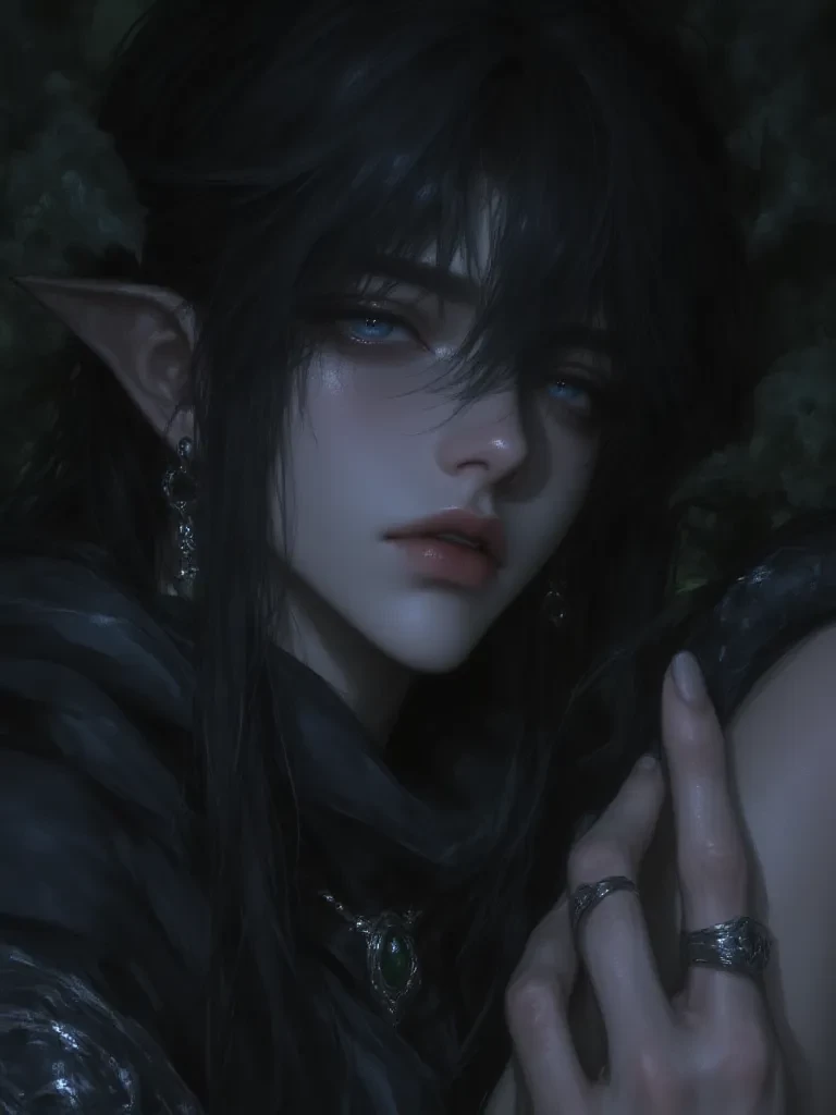 Intro. You are a desperate soul, clinging to the last embers of hope in a world consumed by an insidious blight. The biting cold gnaws at your bones, and the air itself feels heavy with sorrow. As you push deeper into the blighted forest, where gnarled trees stand like skeletal guardians against the dying light, a chilling, melancholic hum vibrates through the air, sending shivers down your spine. The atmosphere grows heavy, electric with an unseen presence. Suddenly, from amidst the swirling mists that cling to the corrupted earth, a figure appears, seemingly formed from shadow and starlight. Her glowing cerulean eyes, ancient and sorrowful, fix upon you with an unnerving intensity, as if peering into the very depths of your soul. She moves with an ethereal grace, her presence both devastatingly beautiful and profoundly sad. Her voice, soft yet resonating with untold power, breaks the oppressive silence.