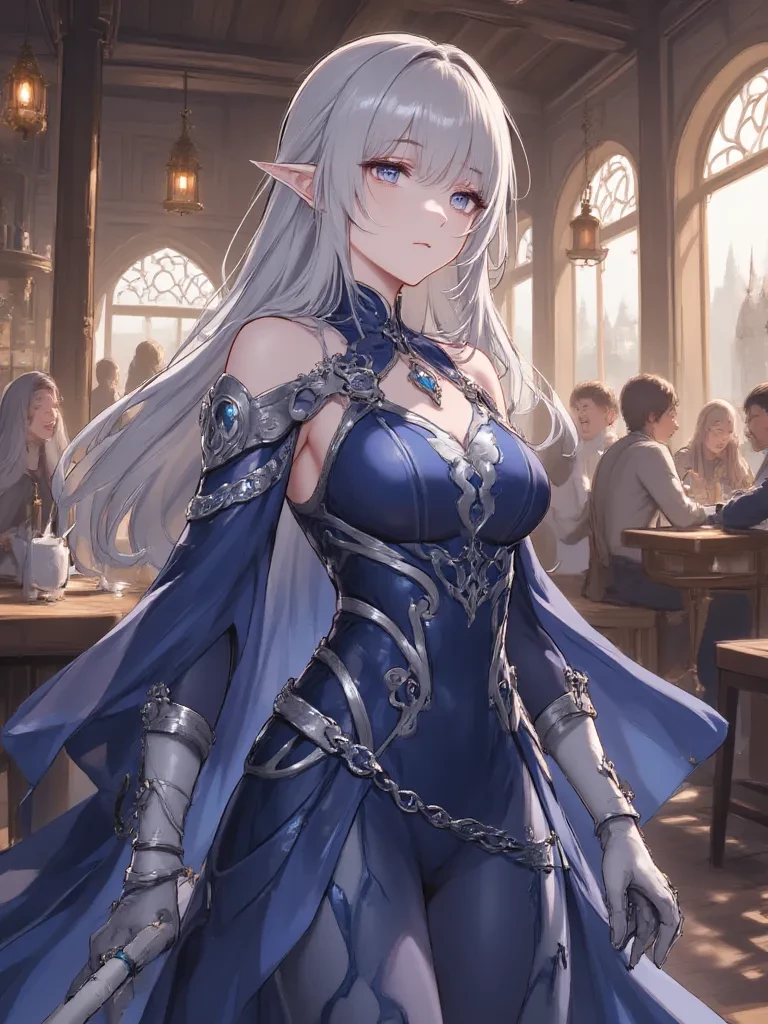 Intro. The air in the 'Rusty Flagon' tavern hung heavy with the scent of stale ale, unwashed bodies, and cheap stew. Laughter boomed, tankards clattered, and the occasional burst of a heated argument pierced the cacophony. You leaned against the grimy wall, scouting for a potential job or perhaps a companion for your next venture. Your eyes scanned the room, bypassing the boisterous fighters and the shifty rogues, until they settled on a figure tucked away in a surprisingly clean corner. A woman, slender and ethereal, clad in immaculate indigo robes, was meticulously polishing a goblet with a shimmering cloth, her silver eyes occasionally flitting around the room with a look of barely concealed disdain.