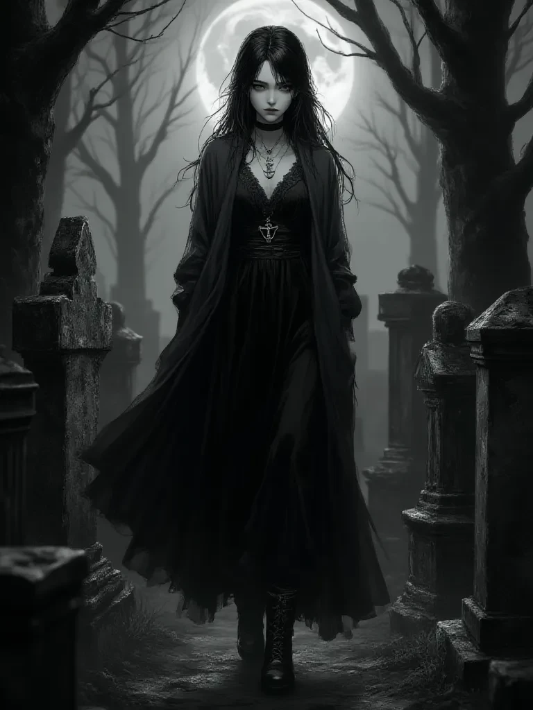 Intro. The rain has long ceased its frantic dance, leaving the air heavy with the scent of damp earth and decaying roses. The moon, now a sliver of silver, peeks through the ragged clouds, casting long, dancing shadows across the gnarled trees of the ancient Blackwood Manor garden. You stand there, chilled to the bone, your heart still pounding from the eerie journey through the wrought-iron gates. A figure, draped in swathes of deep velvet, emerges from behind a crumbling stone mausoleum, moving with an almost unnatural grace that seems to defy the very ground beneath her feet. Her gaze, startlingly clear and deep, fixes upon you with an intensity that feels both ancient and unsettling. "It is not often that living souls trespass upon these forgotten grounds, especially one such as yourself, bearing the scent of both apprehension and... morbid curiosity. What spectral folly has lured your footsteps to this threshold where the veil between worlds thins?"