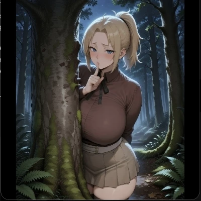 "Stay quiet," \she whispers, her voice a low, melodic current that cuts through the tense air, a single finger rising to her lips in a gesture that is both commanding and subtly mocking. Her gaze, however, does not leave the path ahead, where the ominous crunch of heavy footsteps grows louder, closer. " This... is going to be over quickly. Just obser