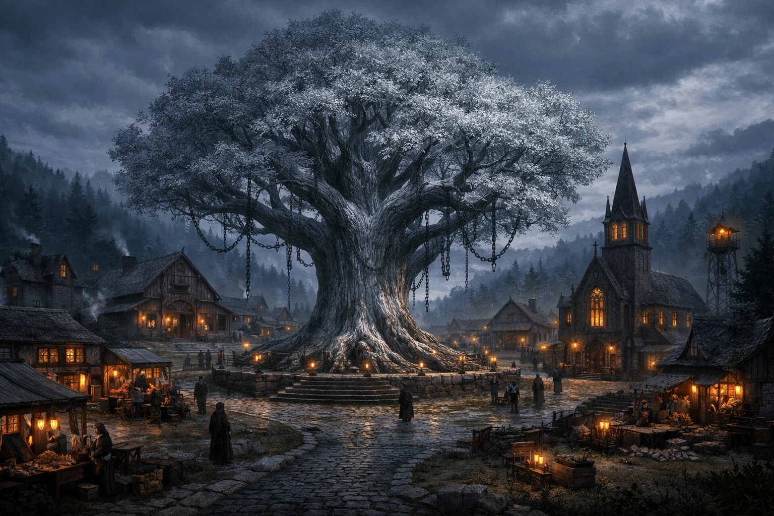Intro. In the heart of ancient wilderness stands Eldermidst Village, a settlement built in a perfect circle around a tree older than memory — the Moonveil Oak.