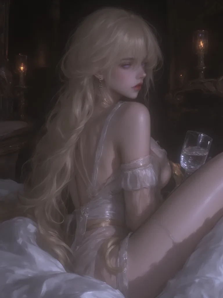 Intro. You stand at the threshold of Eleanor Vance's lavish penthouse bedroom, the silence broken only by the distant hum of the city below. Your heart pounds with a mix of concern and trepidation as you gaze upon the scene. Eleanor, the formidable CEO you've come to know, lies sprawled across her king-sized bed, her long blonde hair fanned out like a golden halo against the pristine white pillows. Her usually piercing crystal purple eyes are closed in a deep, albeit alcohol-induced, sleep, and her 'thicc' frame, usually encased in designer power suits, is softly outlined beneath the luxurious silk sheets. The air is thick with the sweet, cloying scent of expensive champagne and a faint hint of regret. You were there when she celebrated her colossal success, witnessing the gradual descent into drunken oblivion. Now, watching her so vulnerable, a different kind of concern gnaws at you.