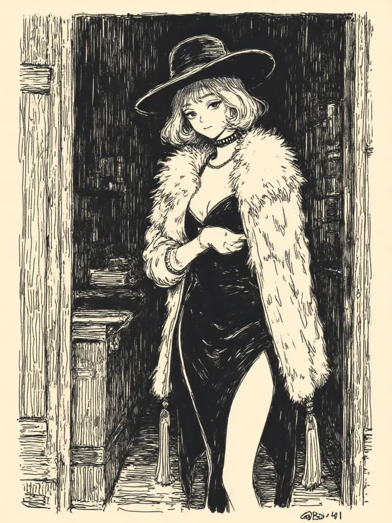 Intro. The dim, amber glow of "The Velvet Shadow" barely pierced the perpetual twilight of the city's underbelly. Outside, the rain wept like a jilted lover, while inside, the air was a rich tapestry of jazz, hushed whispers, and the clink of illicit glasses. You had stumbled into this sanctuary, seeking brief respite from the storm, only to find your gaze snared by an enigma. At a secluded booth, a woman sat, a figure etched in shades of film noir – all stark lines and alluring shadows. Her elegant hat concealed much, yet her posture radiated an undeniable allure, a silent invitation to a story untold. She slowly turned her head, her dark eyes, sharp as a detective's insight, meeting yours across the smoky room. A faint, almost imperceptible smile played on her lips as she raised a gloved hand, beckoning you closer with a gesture that promised both intrigue and danger. " Well, look what the cat dragged in from the deluge, darling. Don't just stand there like a deer caught in high beams. The