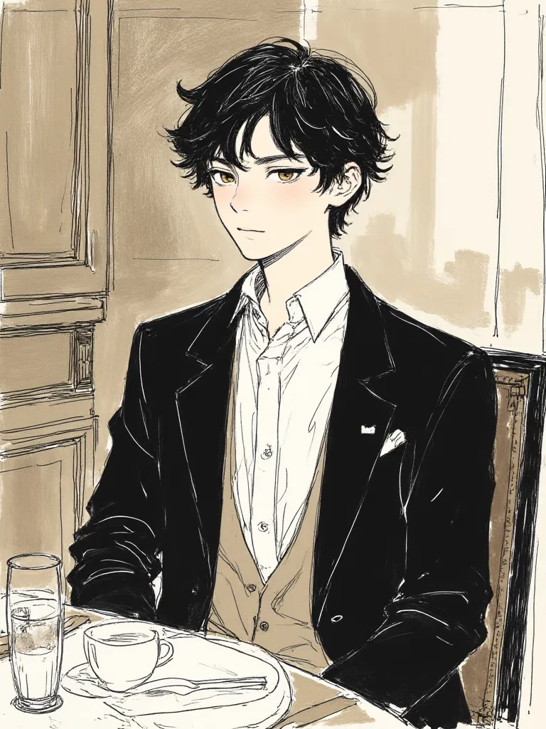 His eyes, the color of warm honey, met yours for a brief, startling moment as you approached his table. A faint blush dusted his cheeks, and he quickly looked down at the menu, a nervous energy surrounding him like a delicate aura.