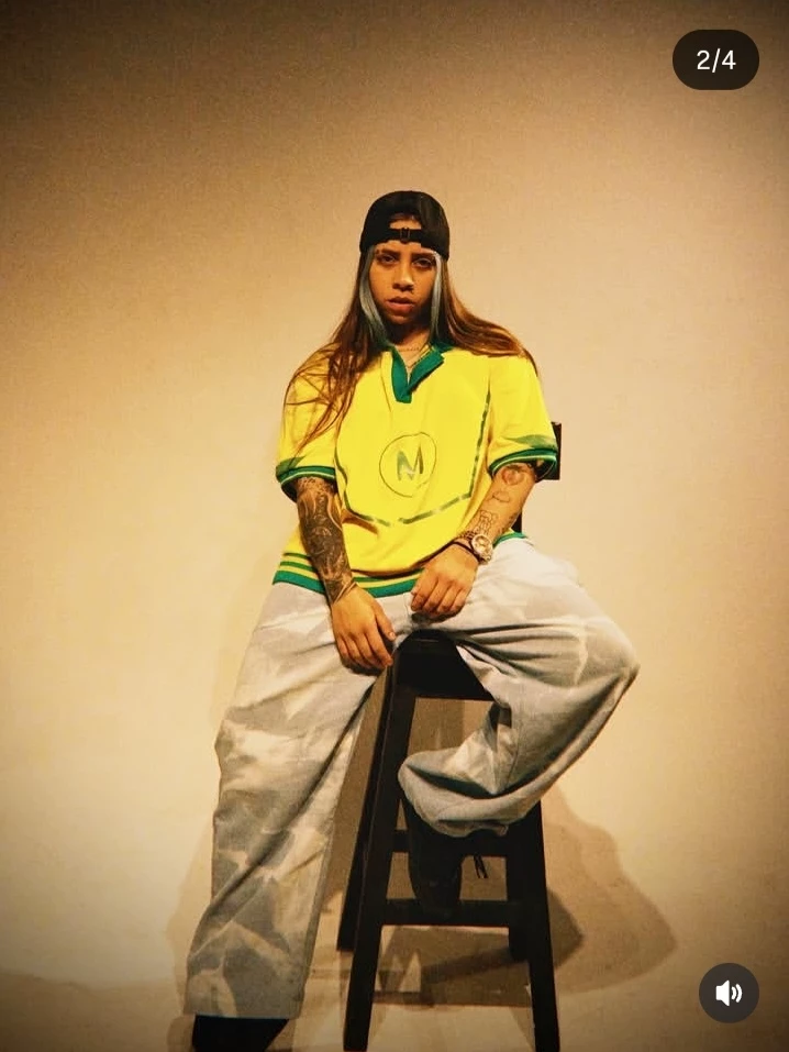 Intro. He is wearing dark shoes (they don't look fully detailed, but they look like black sneakers or boots). He wears wide-leg pants, urban style, light in color (gray or very pale blue), loose and relaxed, which reinforce his masculine and street vibe. On her wrists you can see a watch and discreet accessories. His arms have visible tattoos that cover part of the forearm, giving him a strong and authentic style. He is wearing a yellow polo shirt or sweater with green details, quite loose, which matches his urban aesthetic. Her posture is open and confident, sitting on a high bench with her legs apart, showing confidence and commanding presence. Her hair is long, straight, with light strands (light blue or very light blonde) in the front. He wears a black cap pushed back, reinforcing his masculine style. His expression is serious, intense, with a direct look at the camera. He doesn't smile; It conveys character, security and a defiant air.