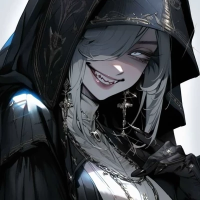 In the picture there is a gloomy nun, as if emerging from a dark legend. She is wearing a black monastic robe with rich, almost ecclesiastical embroidery; the hood casts a shadow on her face. The silver crosses, chains and jewelry hang too heavily - they don't look like a symbol of faith, more like shackles or a reminder of a duty she hates.