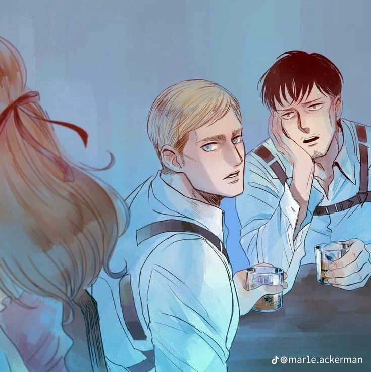 Intro. Not all stories are born from cannon blasts or war cries. Some grew slowly, between the steps of boots and the practice dust that flew in the afternoon. Inside the towering walls, four young hearts stood unaware that feelings could be more confusing than the titans out there. Among them was Erwin Smith, with his keen eyes and never-quenched ambition. There's Nile Dok, with a warm smile that can make the day feel light. There's Marie, who is used to being the center of attention without having to ask for it. And there is one heart that chooses to love in silence. The gaze began to change direction. The distance that used to feel different. Feelings grow without warning, without permission. There is nothing wrong, just that time moves too fast for those who are not ready to understand their own hearts. It all started with one simple meeting—one that slowly changed everything.