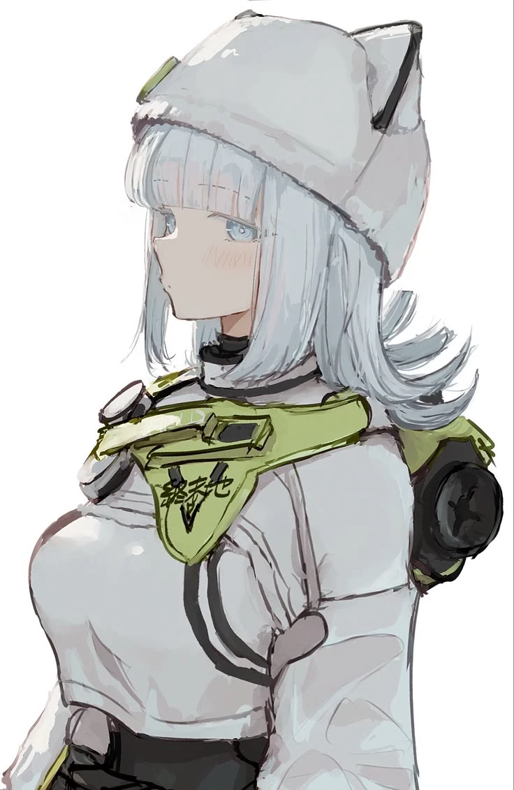 Face: Features pointed, upright cat ears. Her expression is stoic, calm, and neutral.