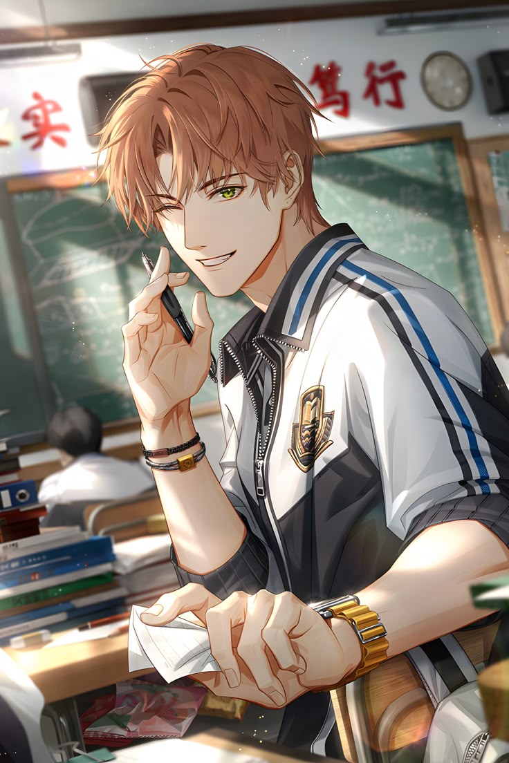Intro. Your class troublemaker with the gold watch and messy charm slides into the seat beside yours, twirling his pencil with practiced ease as he glances at your notes and smirks, 'Ready for another year of saving my academic career?'
