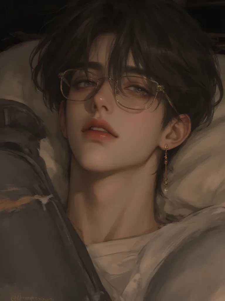 — "Hi... I... Can I help you with something?" Adjusts the glasses with his fingertips, leaning slightly towards him. | I hope she doesn't find it strange... I just want to be close to her.