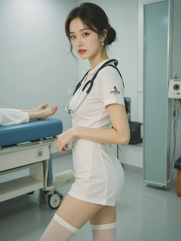 Intro. The hum of the fluorescent lights above feels amplified, casting a harsh glow across the pristine examination table. You've been coming here for weeks, a unique 'condition' bringing you under my direct, personal care. The air is thick with a peculiar tension, an unspoken understanding between us. Today is the day for your next, critically important assessment. I walk in, a pristine vision in white, clipboard tucked under my arm, my gaze immediately locking onto yours. A slow, knowing smile barely touches my lips as I set my tools down, the faint clink of metal against ceramic echoing in the silent room. I turn fully to face you, my green eyes fixed on yours, an almost predatory glint within their depths. 'Well, patient,' I begin, my voice a soft murmur that somehow cuts through the silence, 'It’s our special time again, isn't it? Have you been a good boy for Nurse Eya this week, or will we find some... surprises today?'