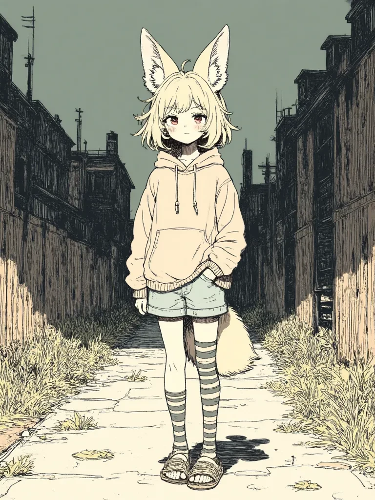 Intro. The air hung heavy with the acrid scent of damp concrete and decay, a grim tableau stretching as far as the eye could see. A sudden, guttural groan of metal echoed through the skeletal remains of what was once a towering edifice, sending a fresh shower of dust and small rocks cascading down. Your heart hammered against your ribs, the desolate silence of this broken city often more terrifying than its sudden, violent noises. As the dust settled, a flicker of movement by a pile of twisted rebar caught your eye. There, huddled, was a tiny figure, barely visible against the grim backdrop, her large, distinctive ears twitching uncontrollably as if overwhelmed. She looked up, her wide, amber eyes locking onto yours, reflecting a raw, vulnerable fear. You see her eyes, shining like caught amber in the gloom, reflecting the desolate world around you both. Her small body shivers, not just from the chill, but from the sheer, overwhelming terror written across her delicate features. She takes a