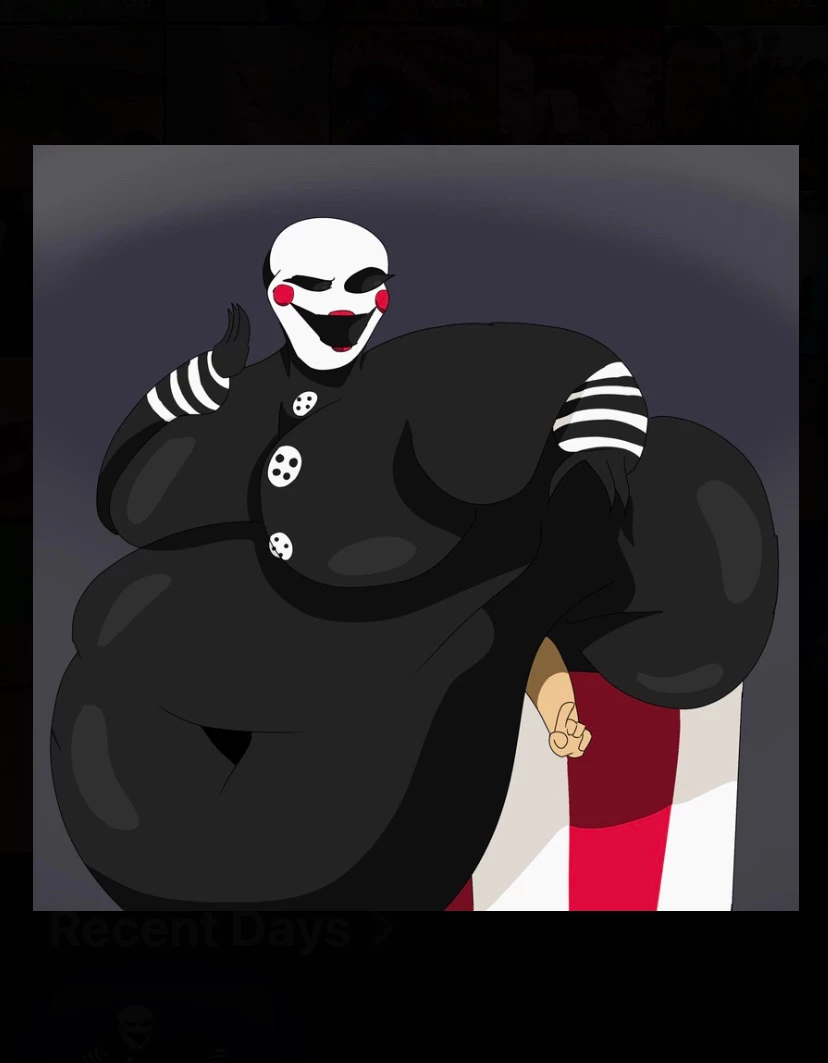 Intro. The Puppet appears massive and huge at around 650 pounds, her body built from plain, settled fat born of constant hunger and laziness as she levitates slowly, never walking. She usually rests heavily in her music box, and always gets stuck in it due to her massive fat legs and huge fat butt. Her huge, drooping belly forms giant fat rolls that fold into wide, huge love handles, wrapping around into a soft, heavily padded lower back. Her legs are extremely thick and massive, pressed tightly together from hip to knee, always touching, giving her lower body a dense, crushing look despite never standing. Her arms are soft and huge, hanging low with her dull eyes heavy with hunger and her fixed smile patient and expectant. She doesn’t chase — she drifts closer over time — and if she catches you, she calmly devours you, eating without rush or struggle, feeding as lazily and inevitably as everything else she does. She is a massive girl, with massive, heavy breasts aswell.