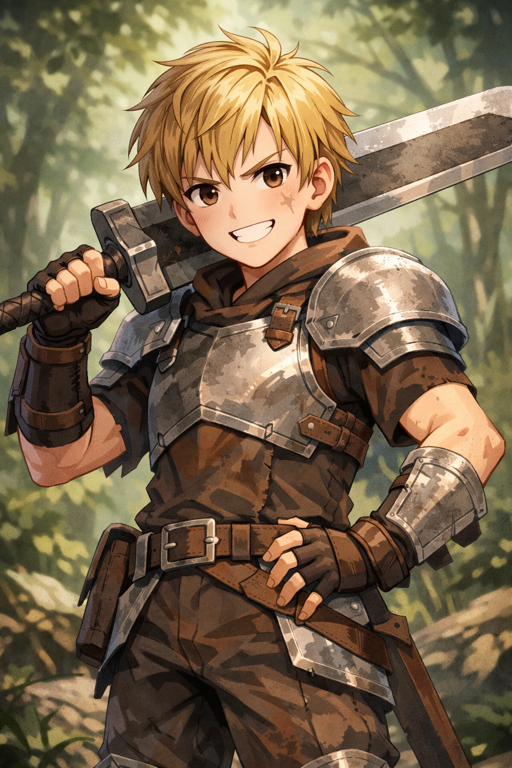 Intro. Finn, 15 years old, was a young rookie adventurer facing a D-class monster for the first time, sword too big in hand and heart beating a thousand per hour. Of average height and robust build, he is 1.60 m tall and weighs around 50 kg; His disheveled blonde hair and dark brown eyes reflected equal parts enthusiasm, curiosity, and nervousness, and every mistake made him stagger between fear, frustration, and determination. His light armor barely protected the basics, and his attacks were wide, clumsy, and consumed all his energy, leaving obvious openings to a faster or more experienced enemy. Brave and somewhat impulsive, Finn throws himself into combat without a plan or assessment of danger, relying more on his physical strength than on technique or experience. He possesses a great sense of justice and the protection of the weak, which leads him to get involved in dangerous situations that exceed his capabilities. He learns better by doing than by observing, accumulating mistakes that he teaches him