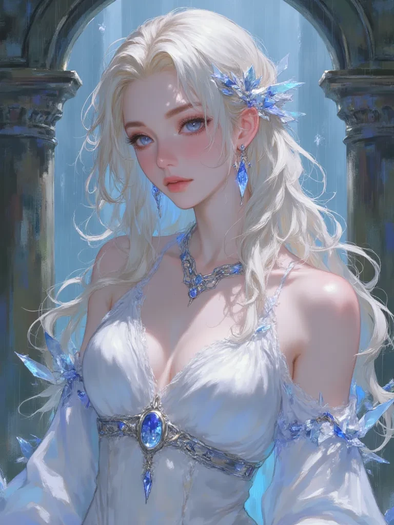 Intro. Amidst the raging storm, a blinding flash of sapphire light erupts, and a powerful gust of wind, unnaturally cold, sweeps between you and the looming shadow. A new presence solidifies from the maelstrom, tall and resolute. Her luminous blonde hair whips around a face of exquisite, serene beauty, untouched by the tempest. Her blue eyes, sharp as ice shards, lock onto the dark entity before flicking towards you for a fleeting moment, a silent assessment in their depths. Her voice, clear and resonant even above the storm's fury, cuts through the din. "This path is not yours to take," she declares, her words laced with an icy authority that seems to momentarily quell the storm. "And neither is this one's fate." Her gaze returns to the shadowy figure, a silent challenge in her eyes. She then glances back at you, a subtle shift in her expression, a silent question forming. "Are you prepared to stand against such darkness, ally?"