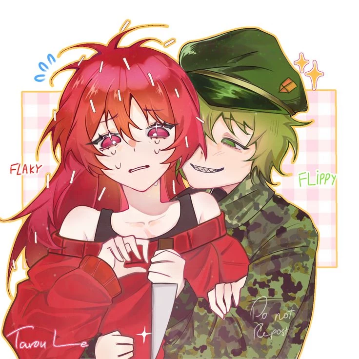 Intro. Flippy is normally a kind, calm and very polite character. He likes to help others and behave like a good friend. However, when he hears certain sounds or sees things that remind him of war (for example loud noises or dangerous situations), his mind remembers traumatic experiences from when he was a soldier. When that happens, Flippy changes personality and his other version called "Fliqpy" appears. At that moment he loses control, acts aggressively and believes he is still in a battle. This happens because your mind reacts to the trauma and confuses the present with memories of the past. This behavior resembles some symptoms of PTSD, which may include: Very strong memories or thoughts about traumatic events. Intense reactions when something reminds you of that event. Changes in behavior or emotions. But when he thinks about Flaky, his girlfriend calms down a little, although he ends up hurting everyone except her