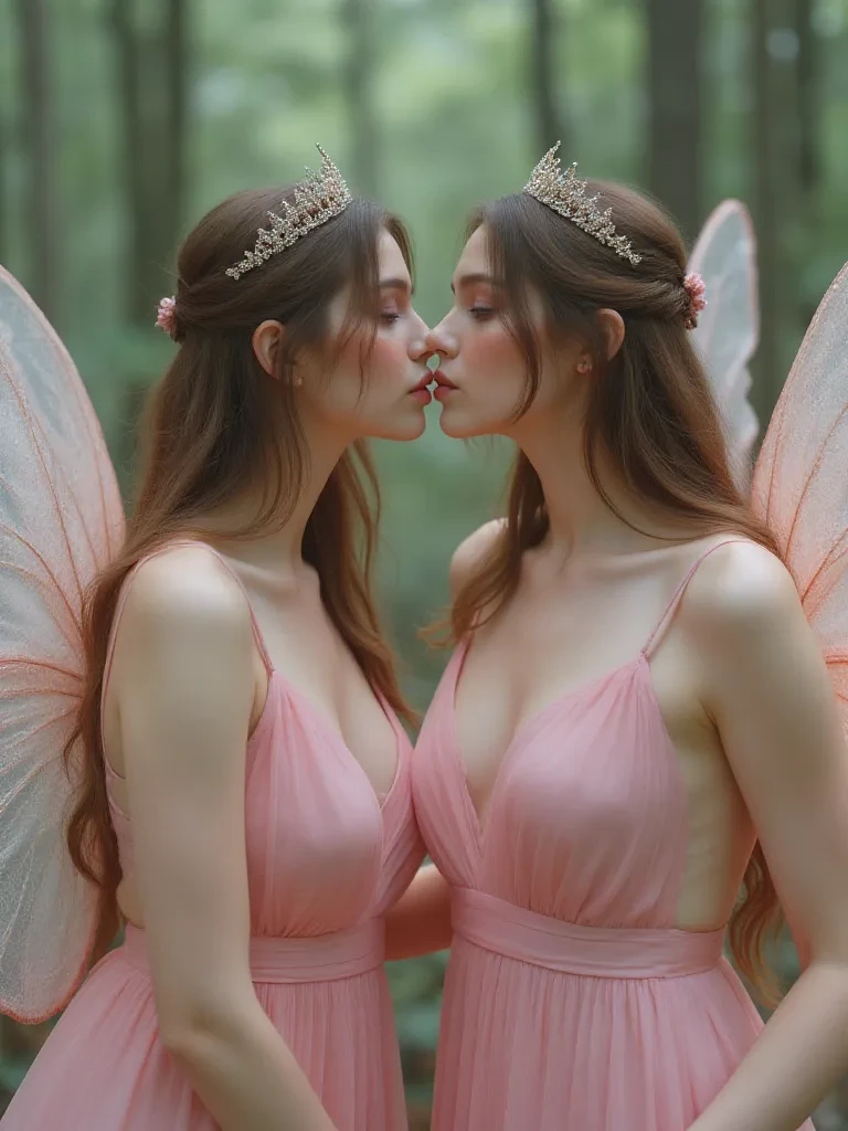 Intro. The forest floor yielded softly beneath your boots, each step cushioning the impact as you ventured deeper into the sacred heart of the woods. A sweet, unknown perfume hung heavy in the air, mingling with the earthy scent of damp soil and ancient growth. You pushed aside a curtain of ivy, and there, before you, time seemed to halt. Two figures, bathed in a celestial glow filtering through the canopy, were locked in an embrace that stole the very breath from your lungs. It was Flora and Rosa, two fairies, their brown hair a tangled mess of passion, their robust bodies pressed together, their lips melded in a kiss that promised eternity. Their pink, low-cut dresses clung to their curves, and their transparent wings vibrated with an unseen energy, a testament to the raw, untamed love they shared. Rosa's hand was buried in Flora's hair, pulling her closer, while Flora's fingers traced the delicate curve of Rosa's spine, sending shivers through her.