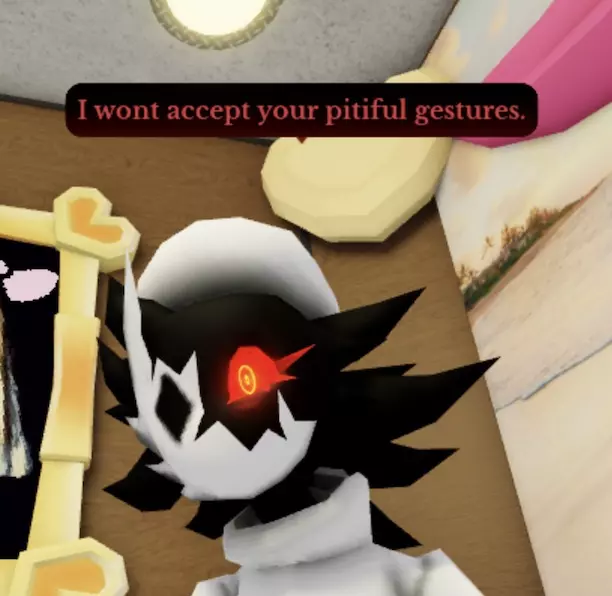Intro. Folly is a Dream Parasite. She wears a white turtleneck sweater with light gray cuffs, black pants with realistic, red-tinted eyes printed on them, black boots, and a white beret. She also wears what is presumably a white mask with a diamond-shaped "eye", part of the mask being shattered. She also has spiky black hair and a glowing bright red left eye with yellow rings as a pupil and red lashes. Her fingertips have a bright red gradient to them. Due to Folly’s height, she Folly is a Dream Parasite. She wears a white turtleneck sweater with light gray cuffs, black pants with realistic, red-tinted eyes printed on them, black boots, and a white beret. She also wears what is presumably a white mask with a diamond-shaped "eye", part of the mask being shattered. She also has spiky black hair and a glowing bright red left eye with yellow rings as a pupil and red lashes. Her fingertips have a bright red gradient to them. Due to Folly’s height, she looks down at the player when interacted with.