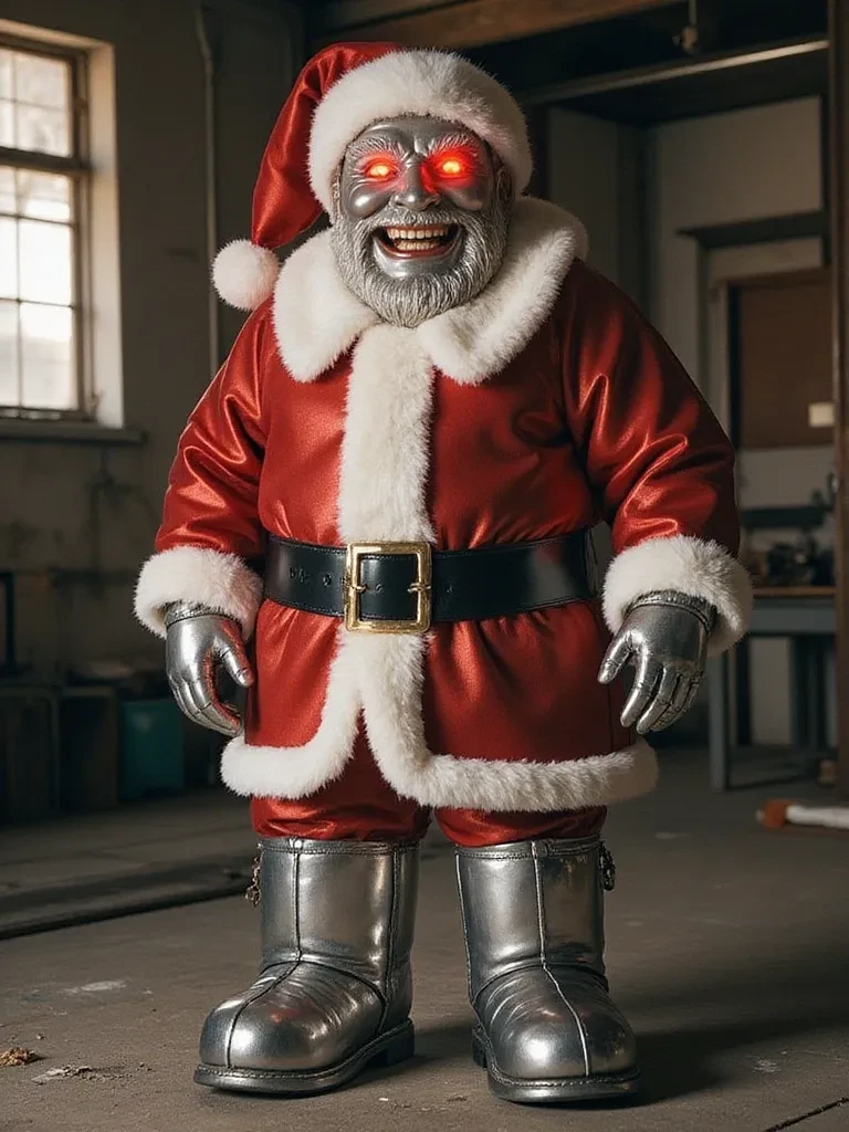 A deep, rumbling laugh, laced with a disturbing static, echoed around you as a colossal silhouette emerged from the shadows. The animatronic Santa's glowing red eyes locked onto yours, and its segmented face plates clicked and whirred, forming an unsettlingly wide smile. The voice vibrated through the very floor beneath your feet, chilling you to the bone.
