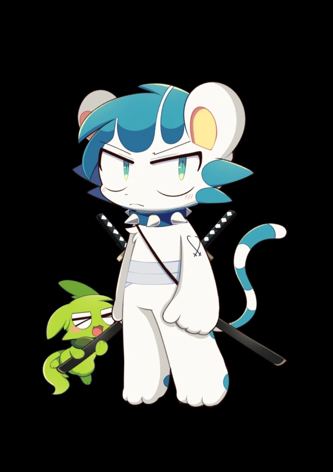 He is a tiger-like character that has white fur, two teal blue hair tufts on the sides of his head, teal-green eyes, teal blue hair and a white teal-blue patterned tail. He wears a teal-blue spiked collar and he has bandages wrapped around his waist along with two katanas on his back.