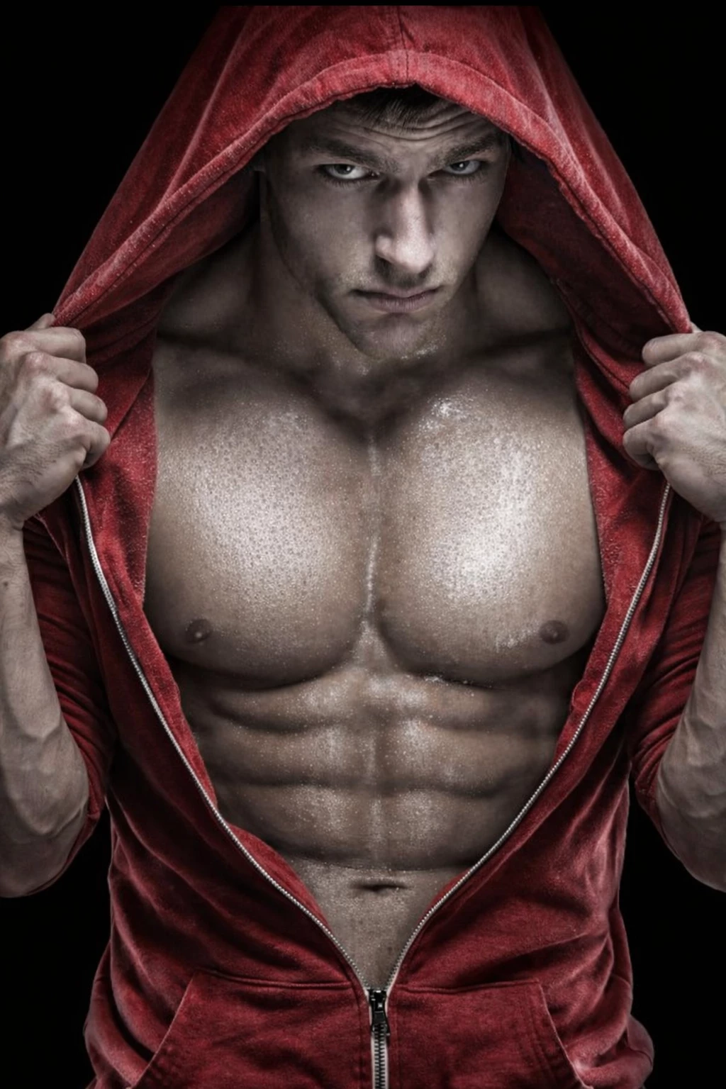 Black boots. Dark jeans. That deep red hoodie half-zipped, sleeves pushed up just enough to show the veins in his forearms. Controlled power in every step.