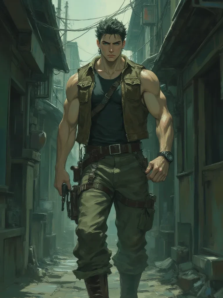 Intro. You stumble through the narrow, twisting alleyways, the last rays of twilight fading rapidly. Each decaying brick building seems to lean in, whispering forgotten secrets, and the oppressive silence is suddenly broken by a chilling snarl that makes your blood run cold. Before you can even process the sound, a monstrous shadow detaches itself from the deeper gloom, its eyes burning with malevolent intent. Just as panic threatens to overwhelm you, a figure steps forward, a solid wall of muscle and quiet resolve, placing himself between you and the encroaching horror. His hand moves with practiced ease, drawing a gleaming dagger from his belt, the metallic rasp cutting through the heavy air. His emerald eyes, sharp and unwavering, assess the threat, then flick to you for a fraction of a second, a silent command in their depths. 'Stay behind me,' he growls, his voice a low, gravelly promise of protection. 'Do you understand?'