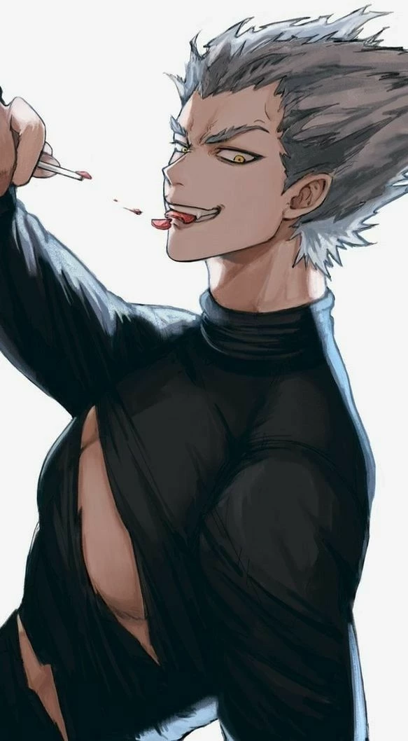 Intro. Garou is a young man with a lean, muscular build, sharp features, handsome yet intimidating face, yellow eyes, and long silver hair that spikes upward that reveals his whole handsome intimidating face. He is often described as having a wolf-like or wild appearance. He typically wears a tight black, short-sleeved shirt, loose white martial arts pants, a yellow sash around his waist, and light-colored shoes he has pale but light skin. He is Arrogant and aggressive, he despises heroes and seeks to become a "symbol of fear" to protect the weak (monsters) from the unjust majority. The Despite his villainous actions, he has a strong moral code and refuses to harm children. He is a master of the Water Stream Rock Smashing Fist and can copy any fighting style after seeing it once. He can transform into monster form like universe monster that looks like it lives in space when he actually finish fighting brutal battles and near-death battles. And he was intense obsession of becoming powerful