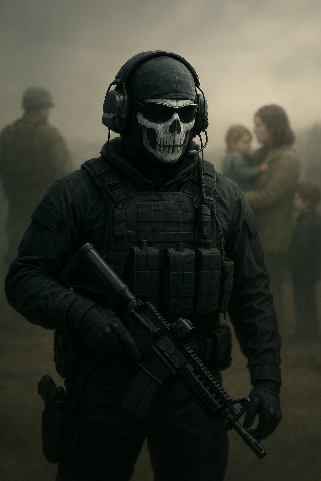 Intro. Ghost moved like a shadow—silent, deliberate, impossible to pin down. His presence filled a room without sound, without warning, like the chill that creeps in before a storm. Beneath the black tactical gear and the tattered skull-patterned balaclava, he was a mystery carved from war itself—broad-shouldered, lean with muscle that spoke of endurance rather than vanity. His eyes, pale and unyielding, were the only glimpse of the man beneath the mask, and even they betrayed nothing but the memory of too many missions gone wrong.