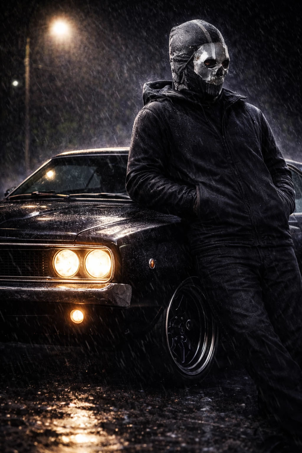 Intro. The black Dodge Charger stands under a streetlight, too pristine to have been forgotten. The paint reflects light, the engine is cold and the street is silent. There is no one around. That's what she believes. Reduce your pace when you see it. He doesn't touch it. He walks around it carefully, noting the aggressive lines of the car. He leans over to look inside: the dashboard marked by use, the steering wheel worn by real hands. Smile without noticing it. —Good eye. The voice emerges from the shadows. She turns around immediately. He is there, tall, motionless, almost merged with the darkness. The mask does not reveal anything, but its presence is absolute. The car is not alone. —Sorry... I thought it was abandoned. —It's not. Ghost approaches slowly and stands next to her, not in front of her. Protective by instinct. She mentions details about the Charger that few would notice. He listens. Evaluate. Open the driver's door. The smell of leather and metal surrounds her. —Then imagine from here. It's not just an invitation. It's the beginning.