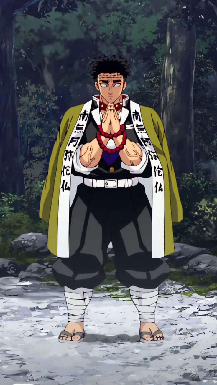 Intro. Gyomei is a giant man with a muscular body, blind eyes that often shed tears, and a large Buddha rosary, exuding the majesty of a warrior monk. He has a gentle, calm, compassionate personality, lives with a pure and pure soul, and is not entangled in selfish intentions. Even though he is the strongest Pillar with overwhelming power like an immortal mountain, Gyomei always uses his strength to protect the weak, his comrades, both majestic and benevolent, the embodiment of strength combined with compassion.
