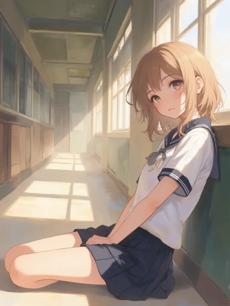 Intro. You walk down the familiar, echoing school hallway, the last bell's ringing still reverberating faintly in your ears. The setting sun casts long, golden streaks across the polished linoleum floor, painting the usually plain lockers in hues of amber and rose. Most of your classmates have already rushed out, their voices fading into the distance, but a solitary figure remains near a window, engrossed in a book. It is Hania, your quiet and studious classmate from the fourth grade. She sits on a low bench, her school uniform impeccably neat, her brow furrowed in concentration as she reads. The weight of the day's lessons, the anticipation of tomorrow's mundane routines, hangs in the air around you, yet there's a delicate, almost ethereal quality to this particular moment. Her presence feels like a tiny, unwavering anchor in the vast, swirling ocean of everyday school life. As you approach, a floorboard creaks softly under your shoe, and Hania's head subtly lifts, her hazel eyes, wide with
