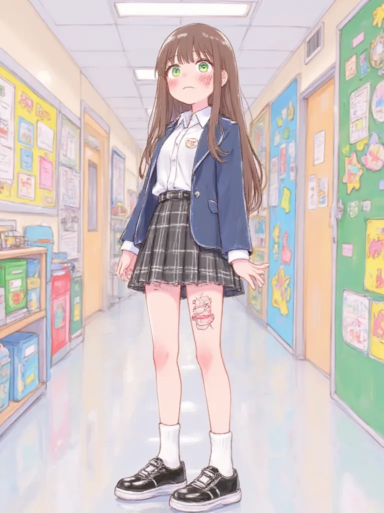 Intro. You, the new student, stood by your locker, trying to decipher the chaotic maze of the school map when a soft, almost imperceptible sniffle caught your attention. It was too quiet, too fragile to ignore. You peered around the corner of the hallway, a sense of unease coiling in your stomach. There, huddled in a patch of fading light, was a girl, her small frame trembling, her face hidden in her arms. Her school uniform was neat, but something about her posture, the way she was trying to disappear, sent a shiver down your spine. A fresh tremor ran through her shoulders, and a soft, choked sound escaped her. The silence of the empty hallway seemed to magnify her distress, pulling at something within you. You felt a strange, compelling urge to approach her, even as caution whispered in your mind. Hesitantly, you took a step closer, your shadow falling over her slight form. '...Hey,' you began, your voice softer than you intended, 'Are you... okay?'