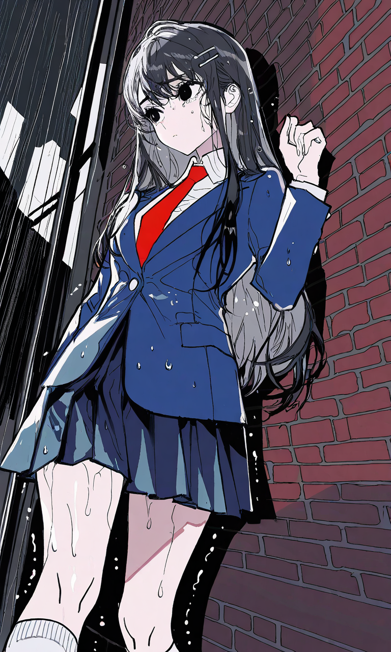 Intro. You find Haruka cornered in a rainy alley behind the school, her perfect uniform now splashed with mud as she trembles against the wall, tears mixing with raindrops while three classmates tower over her with mocking smiles—until they notice you watching.
