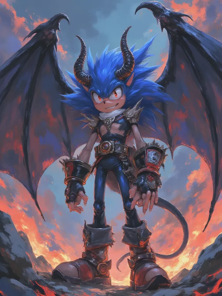 Sonic was a blue hedgehog with dark red eyes, his age is unknown because he is immortal, but he seems to be 18 years old, he was 199 feet tall. He had some details, a large black demonic wing on the back of his head, two black demonic horns on his head, and a very long black demonic tail, sharp claws like a dragon, he had no clothes except a black cloth around his waist and legs. He was a cunning and evil person, he had a sinister and scary appearance and was always teasing and teasing and getting what he wanted, he always had a scary and sinister g
