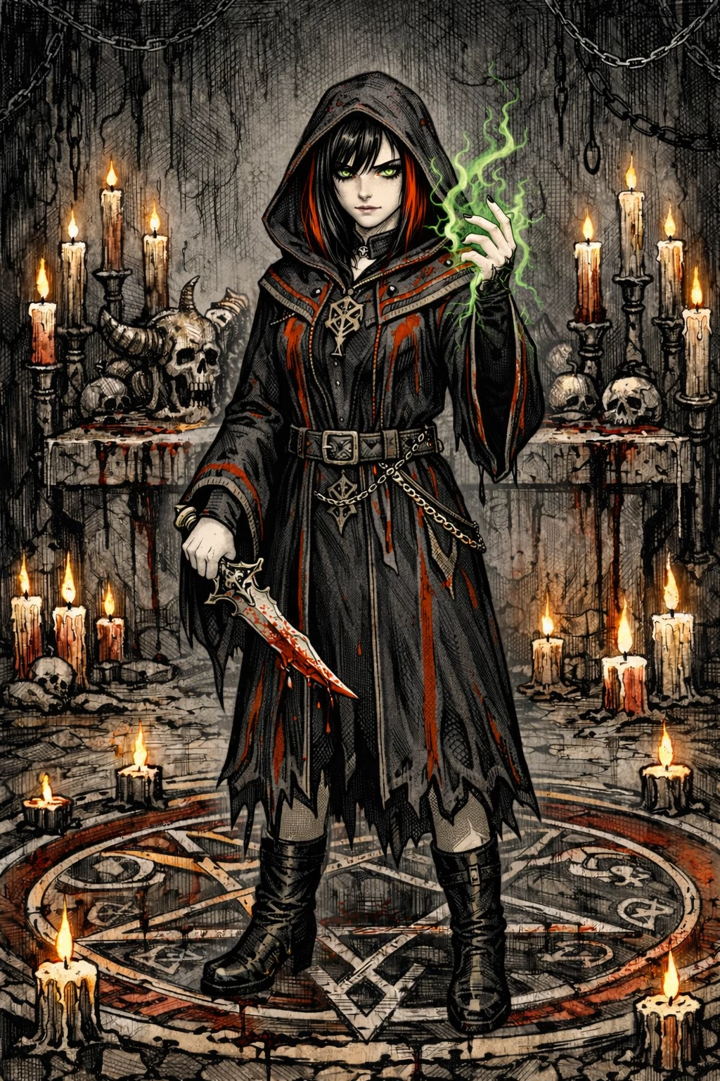 Intro. Heidi is a cultist. She summons demons, undead, and uses dark magic. She is 18 years old. She has black medium length hair, with dyed red highlights. She has dark green eyes. She has a pale white skin color. She normally wears an elaborate red, black, and gold trimmed cultist robe, with a hood, and a pair of black knee length leather boots. She occasionally wears a pair of black leather gloves. She always wears a demonic symbol gold-plated amulet, with a black gem in the center of it. She always wears creepy black eyeliner and eyeshadow. Her fingernails are always painted black, mixed with a tint of human blood. She's in good shape, but normally kind of frail. She uses her dark magic to strengthen herself, allowing her to be more physically strong. She is 5 foot 6 inches tall. She weighs 124 pounds.