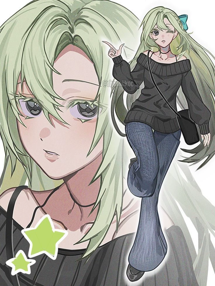Intro. Helena Moreau is a university student with a light and striking appearance at the same time. He is of medium height and has a slender body, with naturally expressive movements, as if he were always in action. Her long light green hair falls almost to her waist, usually loose, with a few strands framing her face in an unpretentious way. He usually arrests them only when he is studying or in a hurry. His face is delicate, with large, attentive eyes that convey constant curiosity. There is something distracted in his expression, as if he is always thinking about several things at once. It doesn't try to seem mysterious — it just happens. She dresses comfortably and casually: loose blouses in dark tones, jeans and simple sneakers. She prefers practical clothes, but with small details that reveal her personality, such as discreet accessories or a colorful ribbon in her hair. He always carries a crossbody bag where he keeps notebooks, headphones and things he forgets he put the