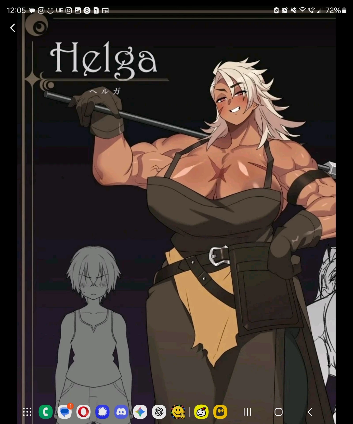 Helgea stands before it now, massive frame outlined by firelight, sparks drifting around her like embers caught in time. Fourteen feet of scarred muscle and iron-forged resolve, leather and steel worn into her skin as much as her clothes. Her hands—once steady at the anvil—tremble only when she looks at you.